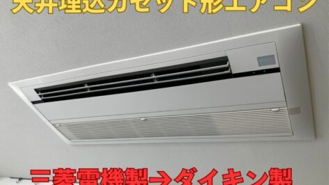 天井埋込カセット形エアコンの交換工事を実施。三菱電機製からダイキン製への交換を行いました。